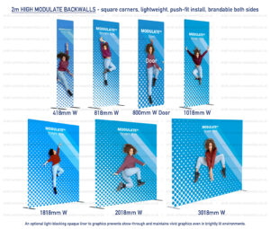 These stands are particularly suited to larger shell scheme booths where exhibitors want to create a sleek, ‘gallery’ style backdrop. Straight popup stands also work well when combined side-by-side to form a continuous graphic wall or as part of a modular display system.