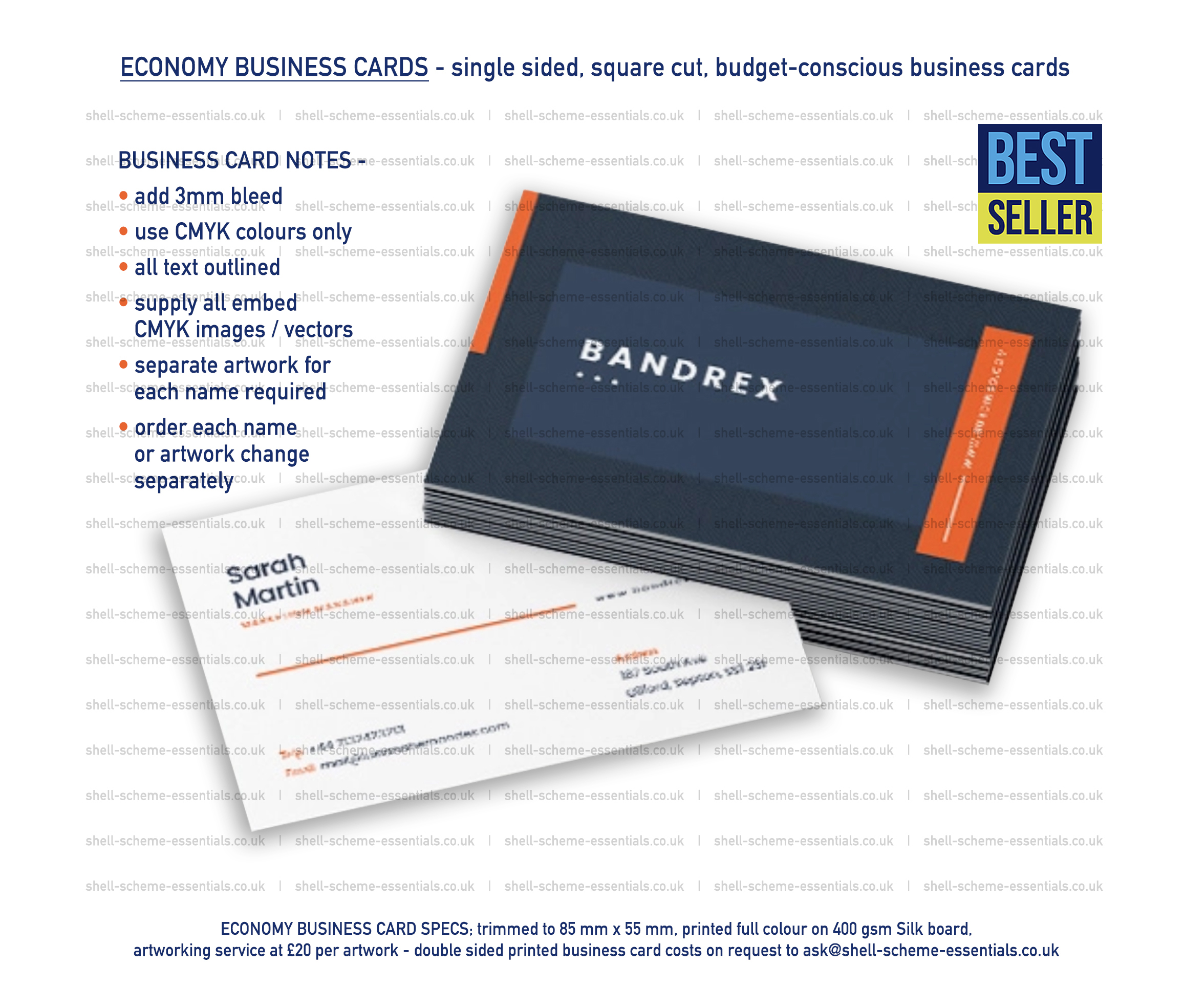 Trimmed to 85 mm x 55 mm – separate online order required for each business card type /name or artwork change.