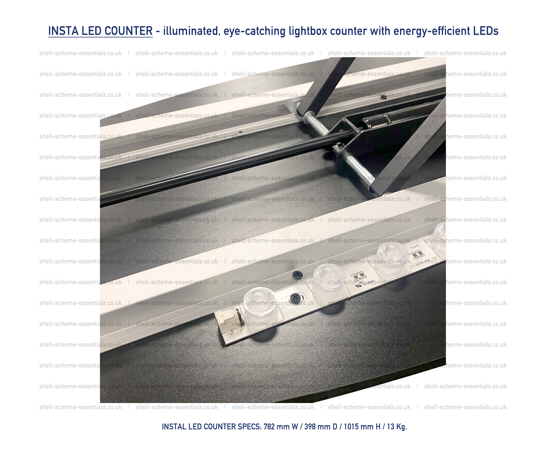 Featuring a pre-assembled internal LED lighting system and smart automatic scissor-lift frame, this counter creates instant visual impact with minimal effort.