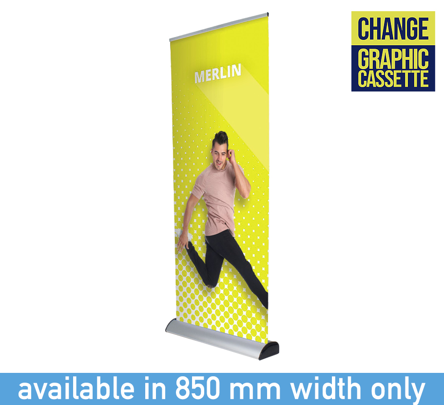 The Merlin roller banner is a sleek, premium display solution with a unique interchangeable cassette system, ideal for businesses that regularly update their messaging. Graphics are quick and easy to change, extending the product’s lifespan and offering excellent value.
